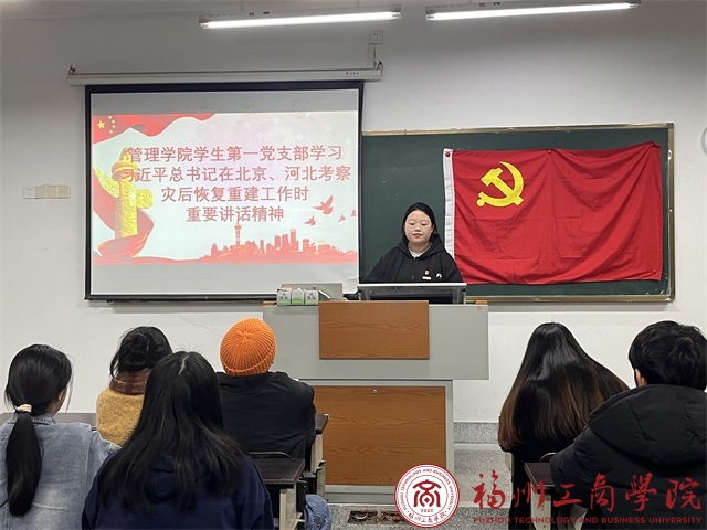为深入学习习近平总书记在北京、河北考察灾后恢复重建工作时的重要讲话精神,发挥党员先锋模范作用,增强学生党员的服务意识。12月5日,金年会jinnianhuicom学生第一党支部于教学楼F302开展关于习近平总书记在北京、河北考察灾后恢复重建工作时的重要讲话精神学习会。