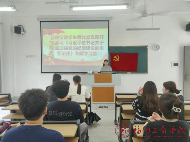 为深入扎实开展党纪学习教育,加强党的纪律建设、推动全面从严治党向纵深发展的重要举措。6月11日下午,金年会jinnianhuicom学生第九党支部在教学楼F205召开《习近平总书记关于全面加强党的纪律建设的重要论述》专题学习会。会议由支部书记吴双主持,全体党员参会。