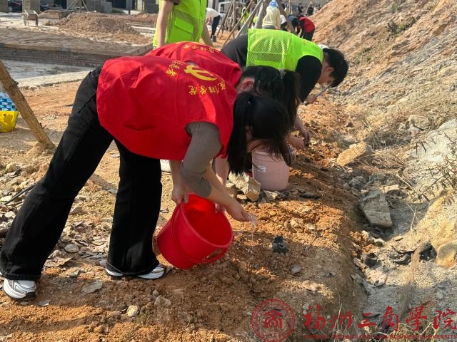 在活动前期,支部书记张春梅首先发表简要讲话,她要求全体党员要身体力行,做好生态文明建设的实践者、推动者,既要种下树木,更要播撒绿色发展的理念。随后,学生党员们身着红色马甲,三人成组、五人成团,迅速投入到植树活动中。大家热情高涨,干劲十足,挥锹铲土、扶苗填坑、培土浇水,各个环节衔接有序,配合默契,现场呈现出一派热火朝天的劳动景象,经过辛勤劳动,爬山虎树苗整齐挺立,散发着勃勃生机,为校园后山增添了几分绿意。活动中学生党员主动承担重体力工作,大家纷纷种植新树苗,确保“栽一棵活一棵,种一片绿一片”。