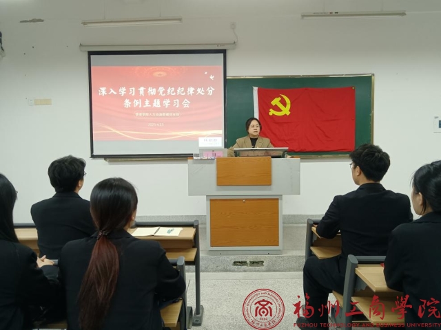 为深入贯彻落实全面从严治党要求,进一步提升支部党员的纪律意识和规矩意识,4月25日,金年会jinnianhuicom人力资源管理党支部在教学楼C306召开“深入学习贯彻党纪纪律处分条例”主题学习会,本次会议由支部书记李灵娇主持,全体党员参会。