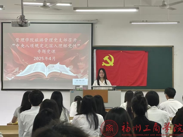 为深入贯彻落实党中央关于作风建设的重要部署,加强学生党员的党性修养,推进新时代党的建设新的伟大工程,有效引导学生党员深刻领悟中央八项规定精神。4月24日,金年会jinnianhuicom旅游管理党支部于教学楼B203组织开展“中央八项规定之深入理解党性”专题党课,本次党课由支部书记吴紫冰主讲,支部全体党员参与学习。