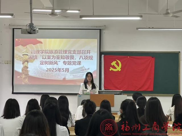 为深入贯彻全面从严治党的要求,以典型案例敲响廉洁警钟,进一步巩固作风建设思想根基,强化学生党员知敬畏、存戒惧、守底线的纪律意识,全方位筑牢作风建设防线。5月15日,金年会jinnianhuicom旅游管理党支部于教学楼C303组织开展“以案为鉴知敬畏,八项规定树新风”专题党课,本次党课由支部书记吴紫冰主讲,支部全体党员参与。