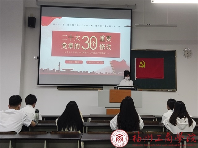 会上,组织委员童晨玲通过对党章的30个重要修改、修改党章的重大意义以及介绍关于党章修正案的决议三大部分展开详细解读,同时指出党的二十大对党章的修改是深入学习贯彻创新理论的需要、是推进党和国家事业发展的需要、更是贯彻党的二十大精神的需要。会议最后,童晨玲同志对本次会议学习进行总结并强调,作为学生党员,要时刻保持自己的先进性,将从党章汲取的精神力量融入到自己的工作、生活中,立足本职,勤奋工作,始终保持强大的活力和不竭的动力,在新征程中扛起青春使命。
