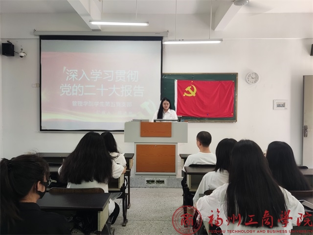 活动伊始,学生党员代表郑诗娴做题为《学习二十大 奋进新征程》的宣讲,内容紧扣党的二十大报告原文,以青年人的方式,学习宣传党的二十大精神。接着,学生党员郑诗娴带领支部党员观看习近平总书记在学习贯彻党的二十大精神研讨班开班式上发表的重要讲话,并就讲话内容组织参会党员积极开展交流研讨。最后,支部书记陈雅珍强调,作为学生党员,要坚定理想信念,强化责任担当,以党的二十大精神为指引,牢记习近平总书记嘱托和希望,从学习党的二十大报告中不断汲取精神力量和经验智慧,矢志不渝地为第二个百年目标而奋斗。