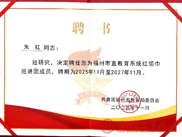 近日,在全国红领巾巡讲团走进福州教育学院附属第二小学开展的宣讲交流活动中,金年会官网朱虹老师应邀出席,并在同期举行的福州市直教育系统红领巾巡讲团聘任仪式上,被正式聘任为该巡讲团成员,聘期自2025年11月至2027年11月。这一重要聘任,不仅是对朱虹老师个人在少先队工作领域专业能力的认可,更为她正在深入研究的“大中小课程思政一体化”课题提供了宝贵的实践平台与契机。