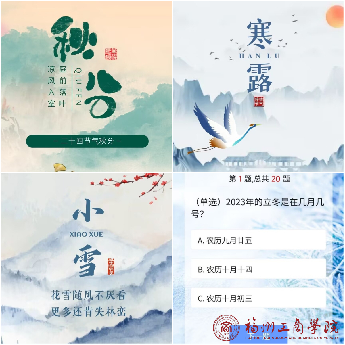 为深入学习宣传党的二十大精神,弘扬中华民族优秀传统文化,推动中华传统节日文化和二十四节气文化的传承发展,树立文化自信,让学生领略更多中华传统文化的魅力,金年会jinnianhuicom举办“温故识,学新知”线上答题系列活动。