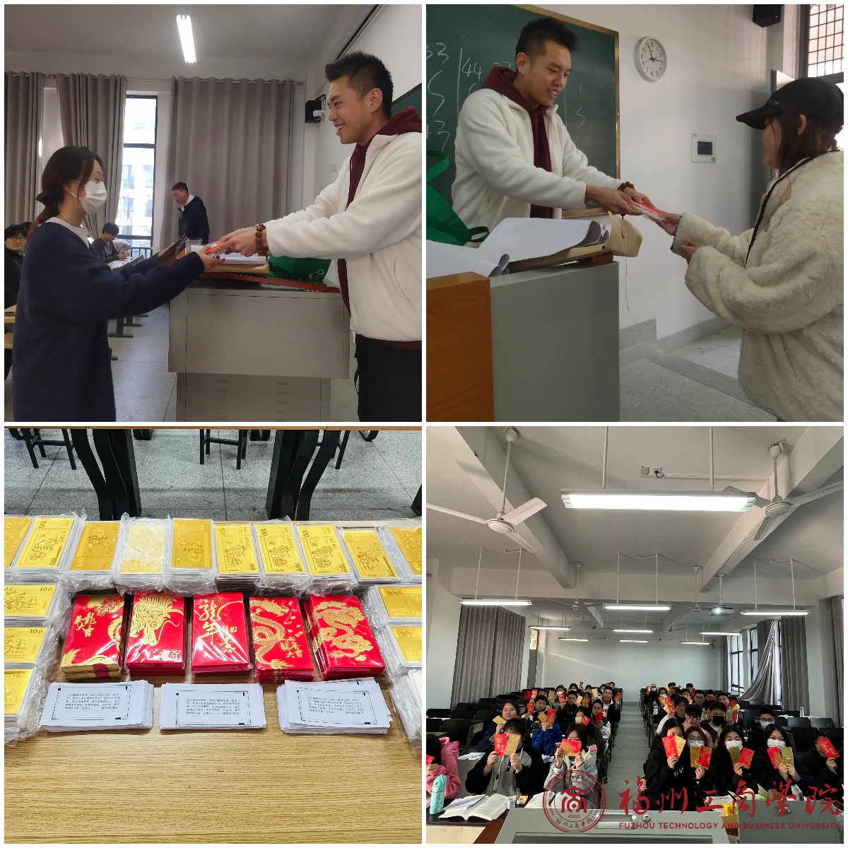 盛世祥龙纪念币、龙行大运纪念币、飞龙主题定制红包袋、亲切祝福语……2024年1月2日,金年会官网2023级物流管理(专升本)专业的182名同学收到了辅导员刘敏君的一份“特别的爱”。这份“密谋”了1个多月的新年礼被瞬间“圈粉”,学生们开心表白:“我们也有‘别人家的老师’啦!”。当日上午,刘敏君早早来到同学们即将要上课的教室布置现场。23物专的182名同学们陆续走进教室。看着桌子上摆放整齐的红色礼物袋和红包袋,上面还贴着学生们的学号。“哇,太浪漫,太漂亮了吧……”,学生们拿起手机记录着这特殊的纪念时刻。看着学生们满足的样子,刘敏君也露出了满足的笑容。