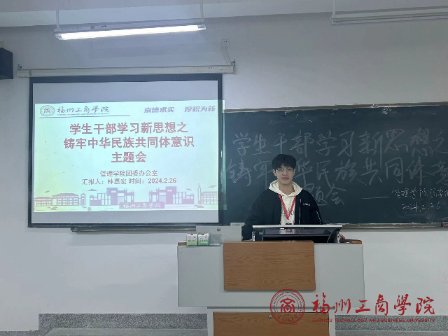 会议伊始,学生干部林嘉宏向全体成员简单介绍了中华民族共同体的内涵,引出了铸牢共同体意识的重要性。随后指出,作为新时代新青年,要深入学习领会、认真贯彻落实,扎实推进中华民族全体成员结成的利益共同体、命运共同体和责任共同体。最后,由陈瑞琼同学,上台分享关于自己对铸牢中华民族共同体的心得,总结出铸牢中华民族共同体意识是满足各族群众美好生活向往的必然要求。只要各民族手挽手、肩并肩,共同努力奋斗,各族人民的日子就一定会越来越红火,就一定能共建美好家园,共创美好未来。