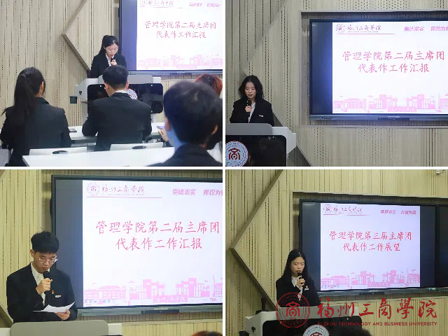 大会第二项,由第二届主席团团委副书记王怡欣同学、学生会副主席陈家如同学、自律会主任王范卿同学进行2023-2024年度工作总结汇报,三位学生干部从聚焦时代热点,引领思想建设;维护学生权益,向前主动服务;创新工作模式,增强工作实效三个方面进行汇报,都期许在新征程上,在学院新阶段高质量发展时期,团学组织要携手并进、步履坚定,以更好的精神风貌做好团学组织工作,做好学生服务,且作为学生干部,应当要不忘初心,满怀青春朝气,为同学们干实事,彰显青春最亮丽的底色。