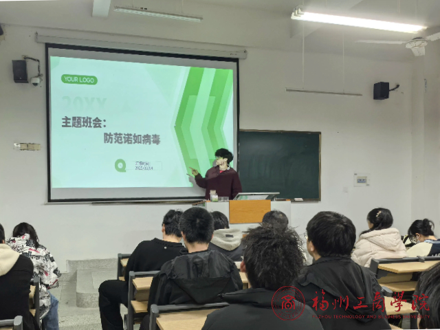 班会伊始,班长张振霆利用图片展示和视频播放等形式,向学生们详细介绍了诺如病毒的特点和传播途径。诺如病毒是一种引起非细菌性急性胃肠炎的病毒,其引起的急性胃肠炎具有发病急、传播速度快、涉及范围广等特点。该病毒全年均可流行,每年10月到次年3月是诺如病毒暴发流行的高发季节,可通过飞沫、呕吐物、粪便的接触或不洁饮食传播。主要症状为呕吐和腹泻,其次为恶心、腹痛、畏寒等。让同学们了解其传播方式及危害性,提醒大家要注意防范,同时多注意观察自身身体状况,如果出现不适应及时就诊并上报辅导员。