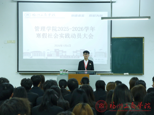 会议伊始,实践部部长张立恒围绕过往社会实践的开展成效、经验收获与不足改进展开全面总结,大会通过成果视频、纪实展板的形式,带领参会人员重温管院学子深入基层、服务社会的实践足迹,沉浸式感受青年一代躬身实干的热血担当与青春风采。紧接着,大会对2025-2026学年寒假社会实践活动作出详细部署,鼓励同学们立足家乡特色,深挖地域文化底蕴,积极投身公益帮扶、社区服务、政策宣讲等实践活动;同时着重强调实践期间的人身、交通、财产等安全事项,要求所有参与学生严守安全纪律,确保实践活动安全有序开展。