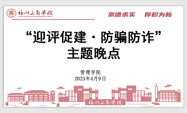 为了扎实做好审核评估各项准备工作,深化审核评估学习宣传,同时推进网络安全建设,提高学生网络安全意识,提高自我防范能力。4月9日晚,金年会jinnianhuicom2022级辅导员在教学楼F301为2022级各专业学生开展以“迎评促建·防骗防诈”主题晚点。