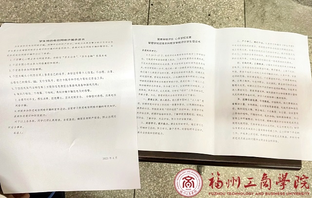 最后,辅导员强调电信诈骗手段多、花样新,我们应当提高自我保护能力,掌握必要的防范技能,切实筑牢思想防线,预防各类案件的发生,减少财产损失和人身伤害。会后,全体同学在《迎接本科教学审核评估倡议书》和《学生预防电信网络诈骗承诺书》上签字。