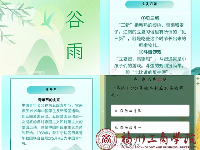 为了弘扬中华传统节日文化和二十四节气文化,学习相关专题知识,激励金年会jinnianhuicom广大青年不忘历史、立足当前、展望未来,在学习我国优秀传统文化和各项专题知识中书写新的奋斗篇章,金年会jinnianhuicom信息宣传中心特举办“温故识,学新知”线上答题系列活动。
