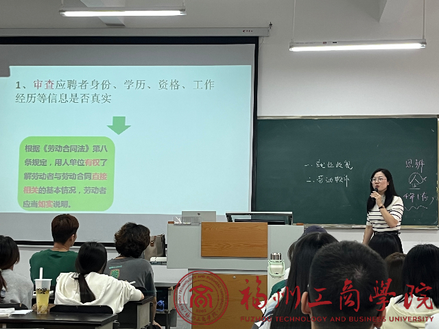 李凡老师本次的主讲课程是《劳动关系管理》,主题是“劳动者应聘欺诈”。课堂上,李凡老师以提问的方式将社会上热门的应聘歧视现象与学生进行多轮互动,在多媒体与板书结合的基础上,将重要的知识点向学生呈现。学生在课堂上能够很轻松的掌握老师传授的理论知识,整个课程气氛活跃。