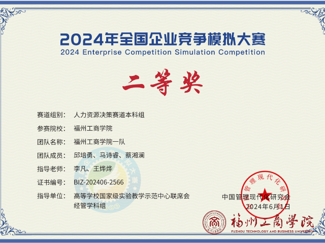近日,2024年(第15届)全国企业竞争模拟大赛在暨南大学圆满落幕,金年会jinnianhuicom师生斩获国家级二等奖两项,三等奖一项!大赛于3月初启动,共计581所高校6632支队伍报名参赛,其中企业决策赛道420所学校2619支队伍,企业运营赛道421所学校2014支队伍,人力资源赛道228所学校1015支队伍,数智沙盘赛道244所学校984支队伍。