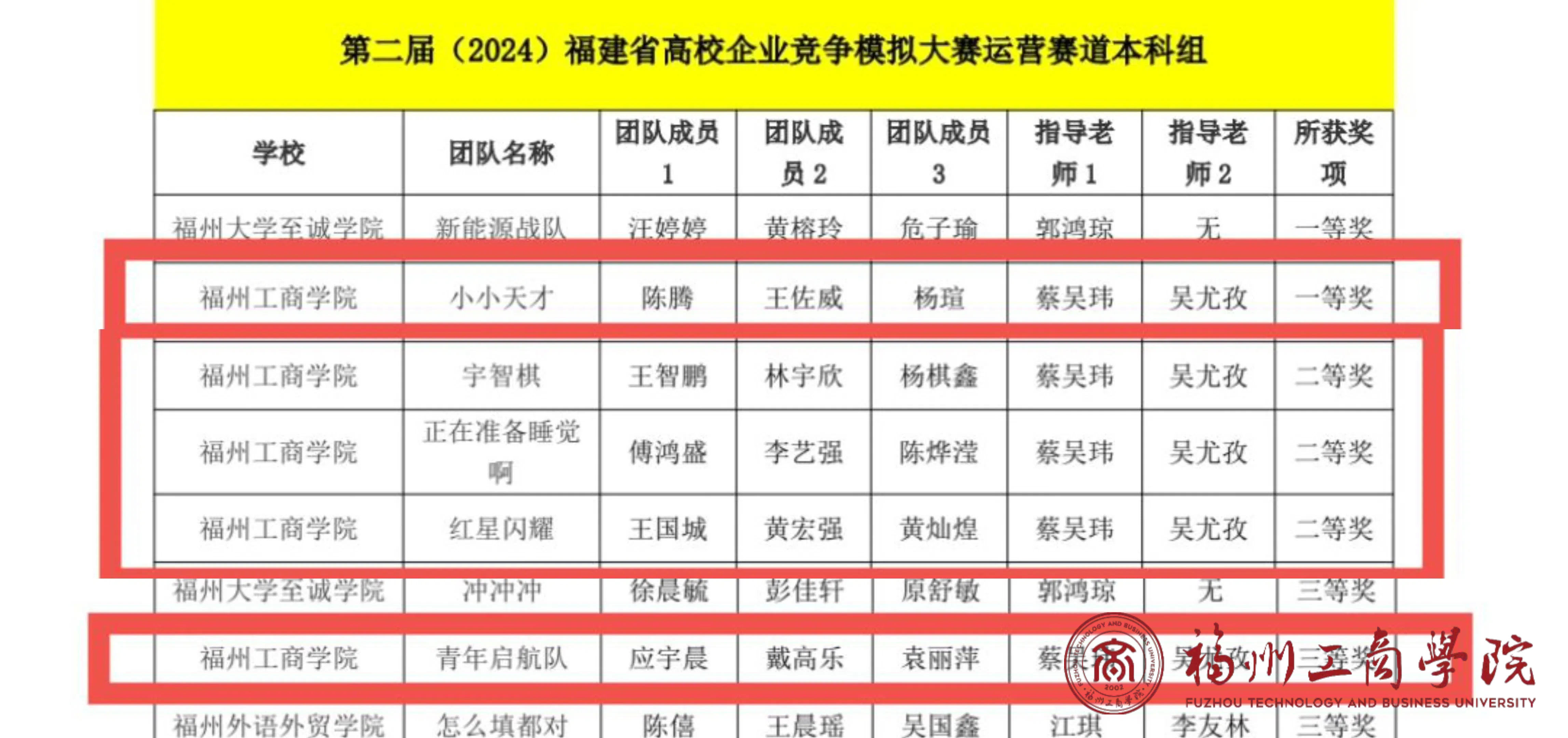 近日,第二届(2024)福建省高校企业竞争模拟大赛圆满落幕,本届大赛共有福建省内22所院校157支队伍报名参加复赛,我校学子与华侨大学、福建师范大学、福建理工大学等高校学生同场竞技。最终,我校学子在运营赛道本科组斩获一等奖1项,二等奖3项,三等奖1项。