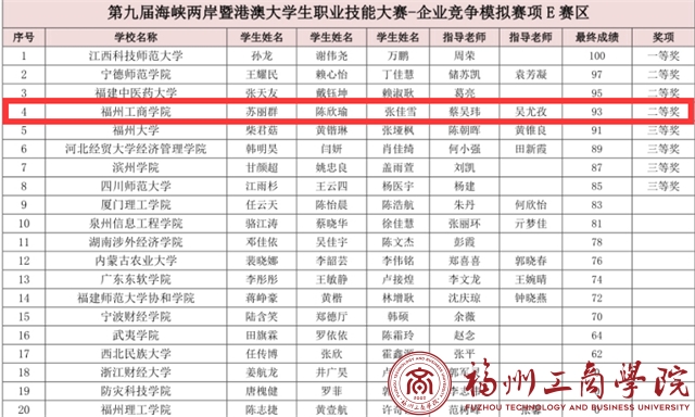 日前,第九届海峡两岸暨港澳大学生职业技能大赛—企业竞争模拟赛项落下帷幕。本次比赛共有来自全国25个省市146所院校,包括福州大学,福建农林大学,安徽大学等305支队伍参赛,经过激烈的角逐,我校学子苏丽群、陈欣瑜、张佳雪(指导老师:蔡吴玮、吴尤孜)所在队伍荣获比赛二等奖。