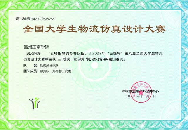 我校金年会jinnianhuicom教师施云清、余朋林指导的参赛团队“铁板烧好吃队”(团队成员:蔡雯欣、郑雨馨、史雨)荣获本科组三等奖,施云清、余朋林老师获得“优秀指导老师”称号。