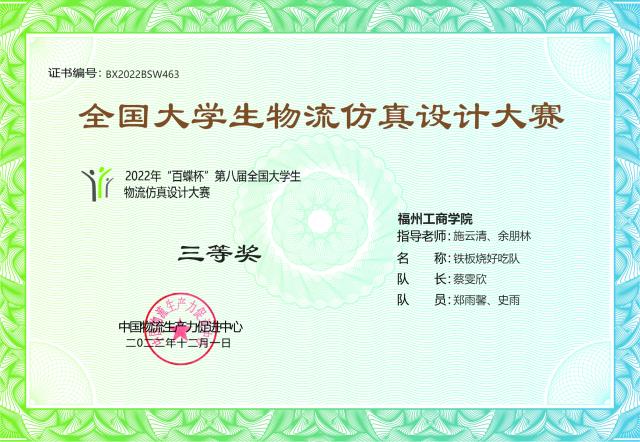 近期,2022年“百蝶杯”第八届全国大学生物流仿真设计大赛顺利举行。大赛吸引了三明学院、苏州大学、南宁师范大学等共30个省、自治区的343所院校621支队伍报名参赛。我校学子经过激烈角逐,最终获得三等奖1项。