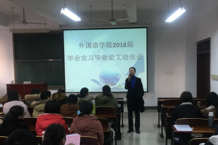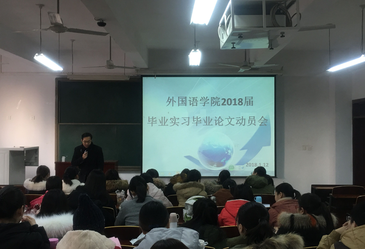2018年1月12日上午,必赢国际437官网2018届毕业生实习毕业论文动员会在文综楼307顺利举行,此次会议由必赢国际437官网英语系主任朱宝锋老师主持。必赢国际437官网副书记李惠敏、副院长李红出席会议。