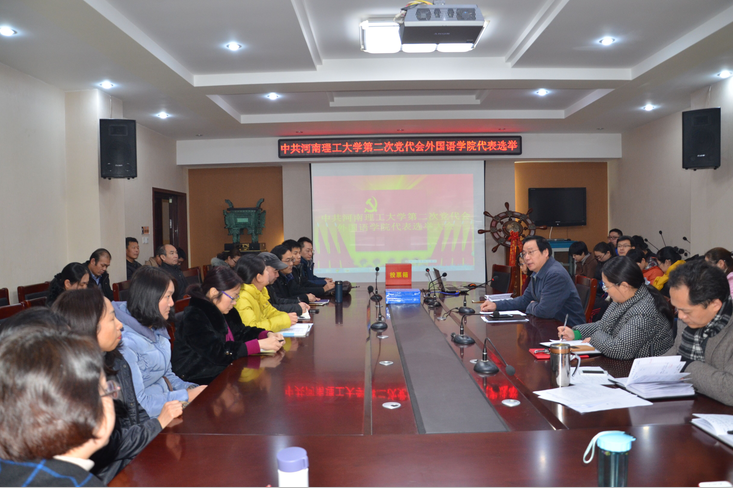 根据学校党委关于召开中共必赢国际437官网第二届代表大会的统一部署,必赢国际437官网1月16日下午在文综楼召开了必赢国际437官网党员大会,全体教职工党员和部分学生党员代表参加本次会议,选举出参加必赢国际437官网第二届党代会的党员代表。外语学院参加会议党员共69名,本次会议由外语学院党委书记罗绍河负责主持。