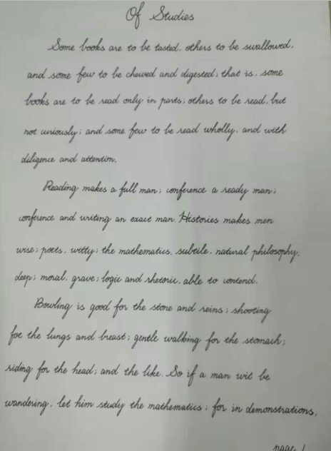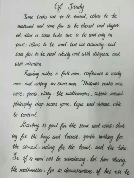 下午两点半,所有同学签到之后,大家按座位坐好,开始认真抄写文章。教室里寂静无声,每个选手都聚精会神,认真地书写着。有的同学写的英文如行云流水,仿佛写的不是字,而是一朵朵小花;有的写起字来一笔一划,如同雕刻家在打磨一件件作品。大家妙笔生花,用不同的字体,如英文圆体字,连体字,花体字等,在抄写纸上留下了自己最高水平的英文书写体。