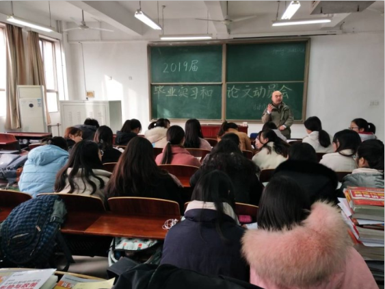 王志军强调了毕业实习和毕业论文工作的必要性和重要性。对毕业论文的进度安排做了具体详细的说明,他着重强调了毕业论文应注重真实性,并表示学院和日语系将会加大查重力度,杜绝抄袭行为。