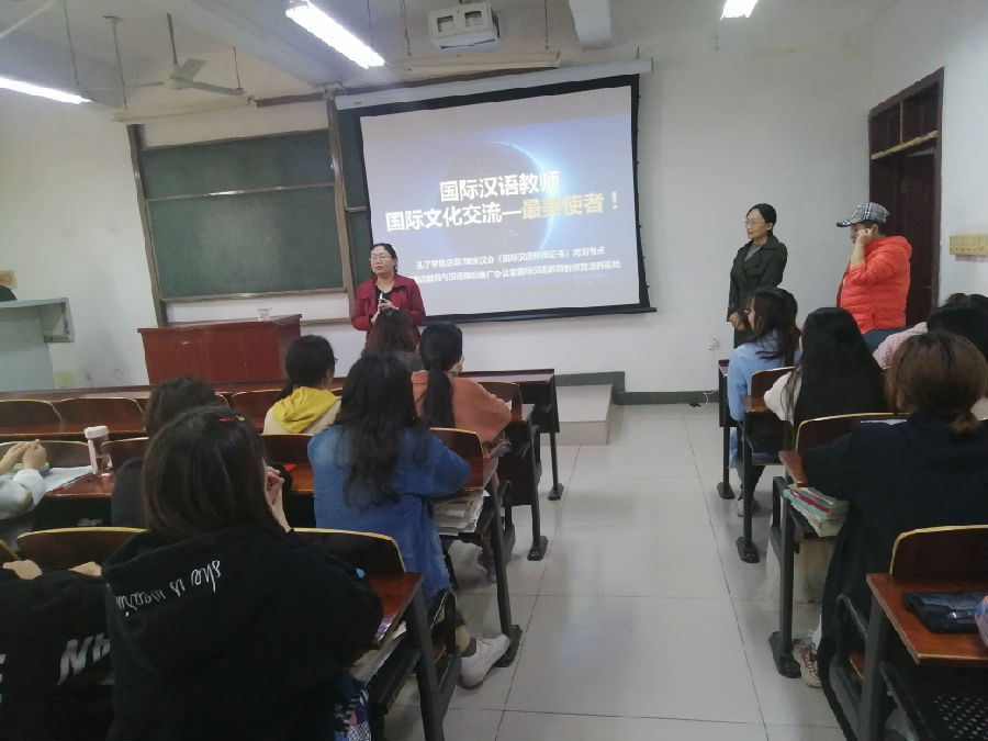 11月8日,应必赢国际437官网之邀,河南省教育厅与汉语国际推广办公室国际汉语教师师资培养基地黄秋丽、徐英英等专家在必赢国际437官网南校区文综楼306教室进行“汉语国际教师,国际文化交流——最美使者!”宣讲会。本次宣讲会主要分为两部分:第一部分为师生交流会,由必赢国际437官网大三全体学生及汉语国际教育专业全体研究生参加。第二部分为师生座谈会,主要由2019级汉语国际教育研究生参会。